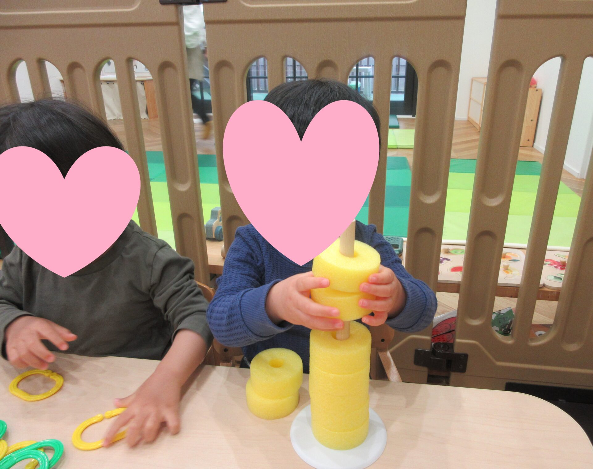 男の子たちは机を囲んで、ぽっとん落としやネジ型の玩具で指先あそびをしています✨