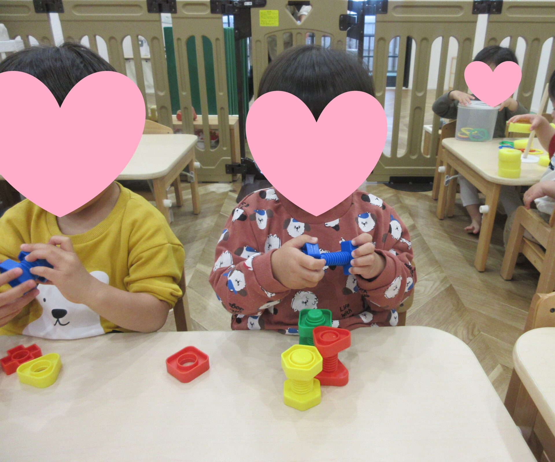 男の子たちは机を囲んで、ぽっとん落としやネジ型の玩具で指先あそびをしています✨