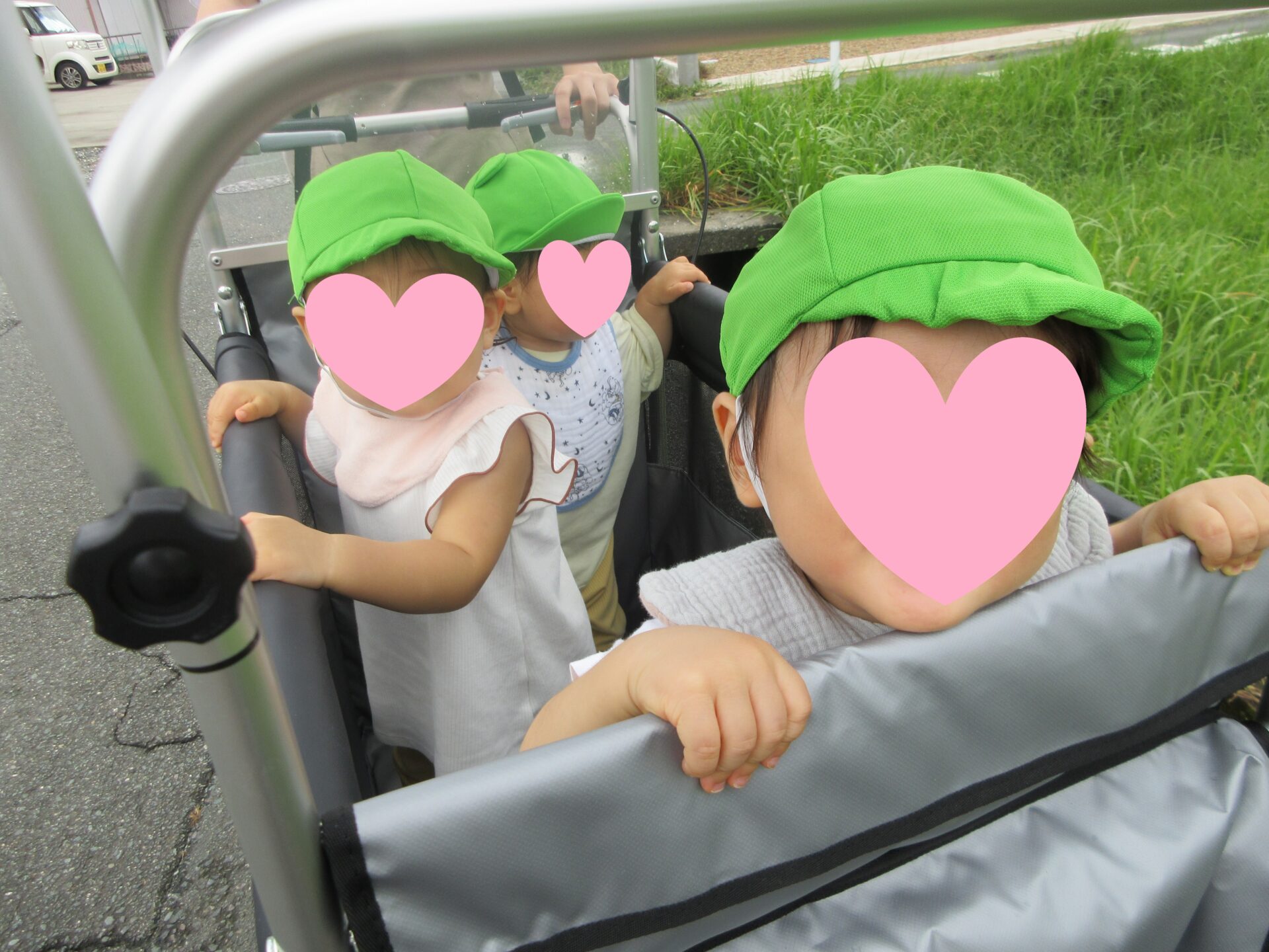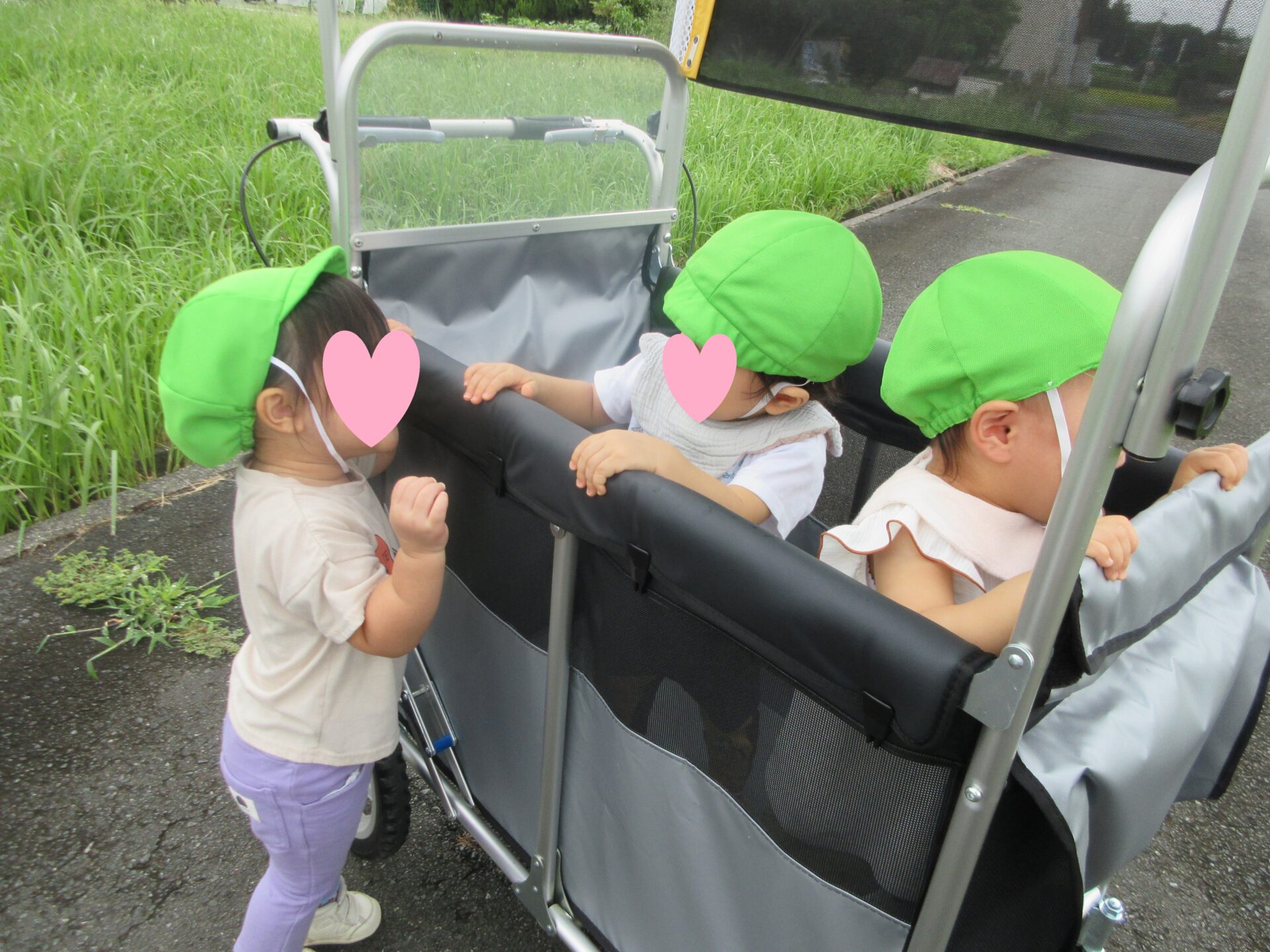 夏前はベビーカーに乗っていたりす組さんが、お散歩カートに立てるようになりました✨