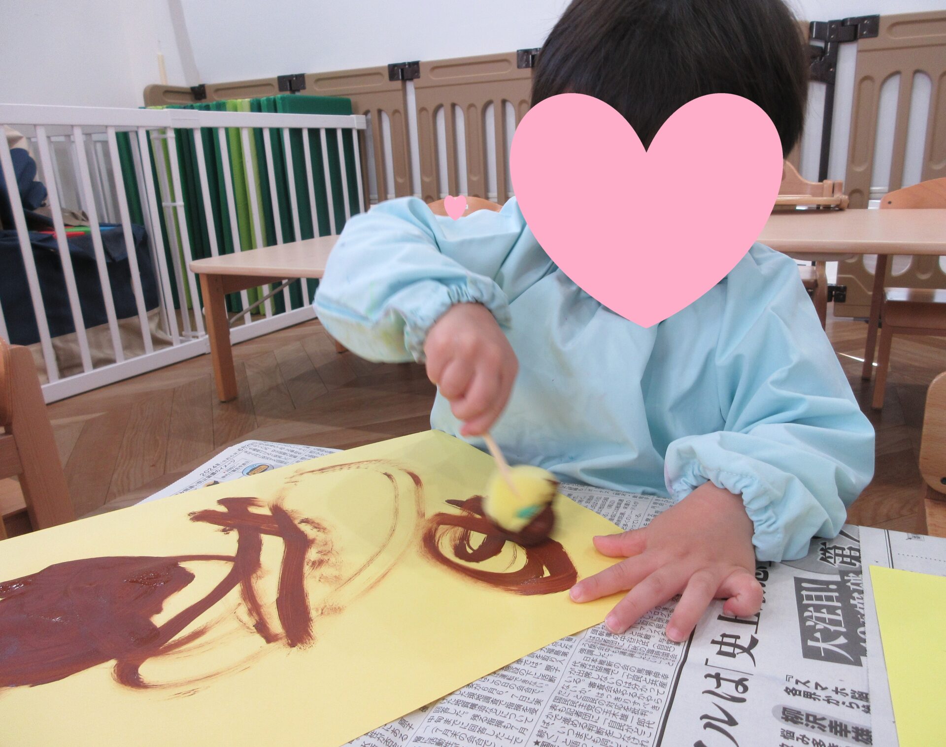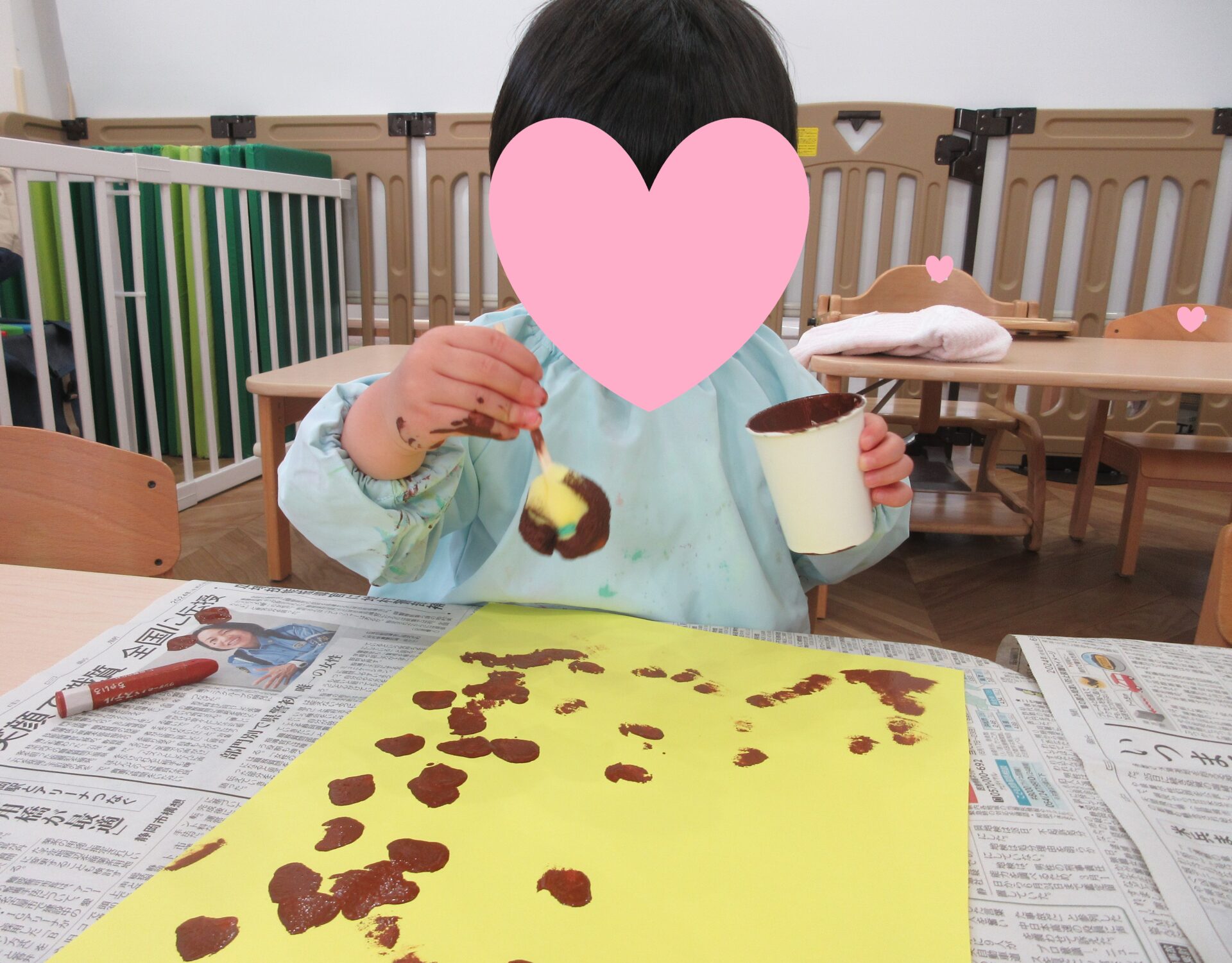 黄色い画用紙に、スポンジでできた筆を使って思い思いに絵の具をのせていきます🎨
