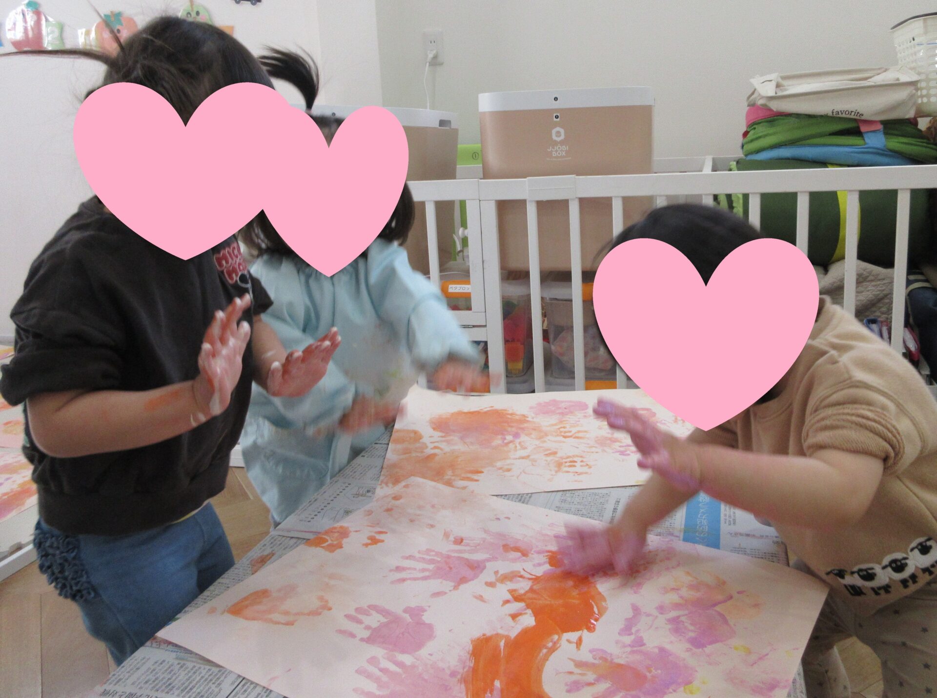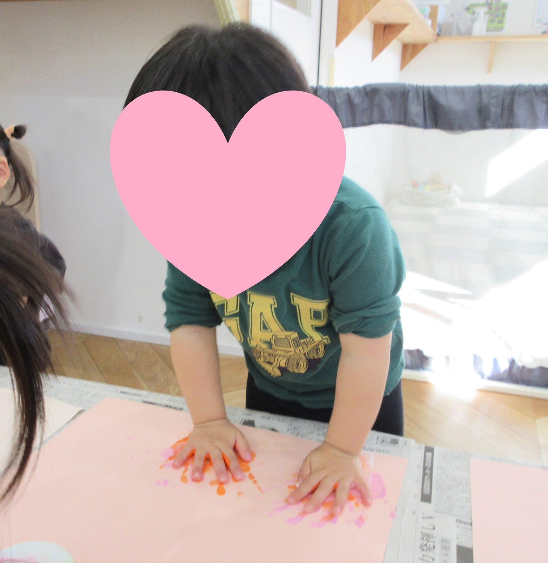 お友達と一緒に自分の手形が付くのが楽しくて、画用紙いっぱいに色が広がりました✨