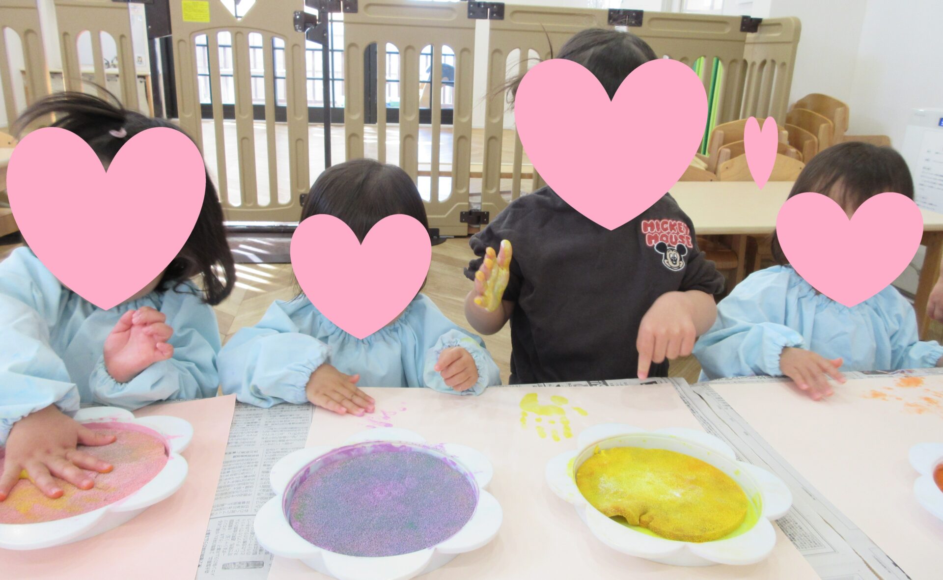 お友達と一緒に自分の手形が付くのが楽しくて、画用紙いっぱいに色が広がりました✨